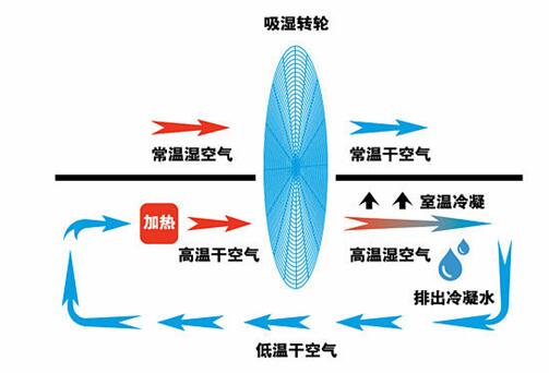 轉(zhuǎn)輪式除濕機的工作原理是通過持續(xù)重復(fù)吸濕再生動作,在不影響空氣流通的情況下,不斷連續(xù)的提供低露點的干燥空氣。形象的說轉(zhuǎn)輪除濕機就像是用干毛巾吸收了空氣的水,又把水分用烘干的方法排出。